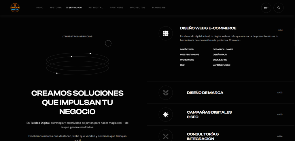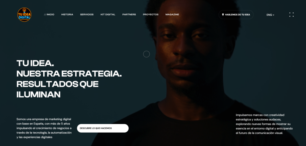 Proyecto web corporativo desarrollado para la agencia de servicios digitales en la que trabajo, enfocado en ofrecer una imagen moderna, clara y profesional.